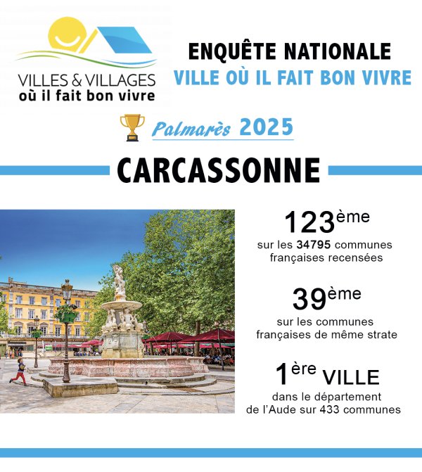 Actualité Carcassonne parmi les villes où il fait bon vivre en 2025 Cadre de vie Zoom de l'image L’association « Villes et villages où il fait bon vivre » a dévoilé son classement 2025 des communes françaises offrant la meilleure qualité de vie. Cette étude de référence repose sur une enquête nationale approfondie et une analyse rigoureuse de 190 critères précis, couvrant notamment la qualité de vie, la sécurité, la santé, les transports, les commerces, l’environnement et les loisirs. Au total, ce sont 34 795 communes françaises qui ont été passées au crible. Et le résultat est sans appel : Carcassonne se distingue brillamment au niveau national. Carcassonne en excellente position dans le classement 2025 La ville confirme son attractivité et son dynamisme en se hissant à des places remarquables : 123ᵉ sur 34 795 communes françaises 39ᵉ parmi les communes françaises de même strate 1ʳᵉ ville du département de l’Aude, devant 433 communes Ces résultats témoignent de la qualité du cadre de vie carcassonnais, reconnue bien au-delà des frontières du département. Un cadre de vie reconnu au niveau national Ce classement met en lumière les nombreux atouts de Carcassonne : un patrimoine historique exceptionnel, une offre culturelle riche, des services de proximité, un environnement naturel préservé et une vie locale dynamique. Autant d’éléments qui contribuent au bien-être quotidien des habitantes et habitants. Une fierté pour les Carcassonnaises et les Carcassonnais Cette reconnaissance nationale est une très bonne nouvelle pour les Carcassonnaises et Carcassonnais, qui voient leur ville récompensée pour ses efforts en matière d’aménagement, de services et de qualité de vie. Elle renforce également l’attractivité de Carcassonne pour les nouveaux habitants, les familles et les porteurs de projets. Carcassonne confirme ainsi sa place parmi les villes françaises où il fait bon vivre en 2025, et s’impose comme une référence dans l’Aude et au-delà.