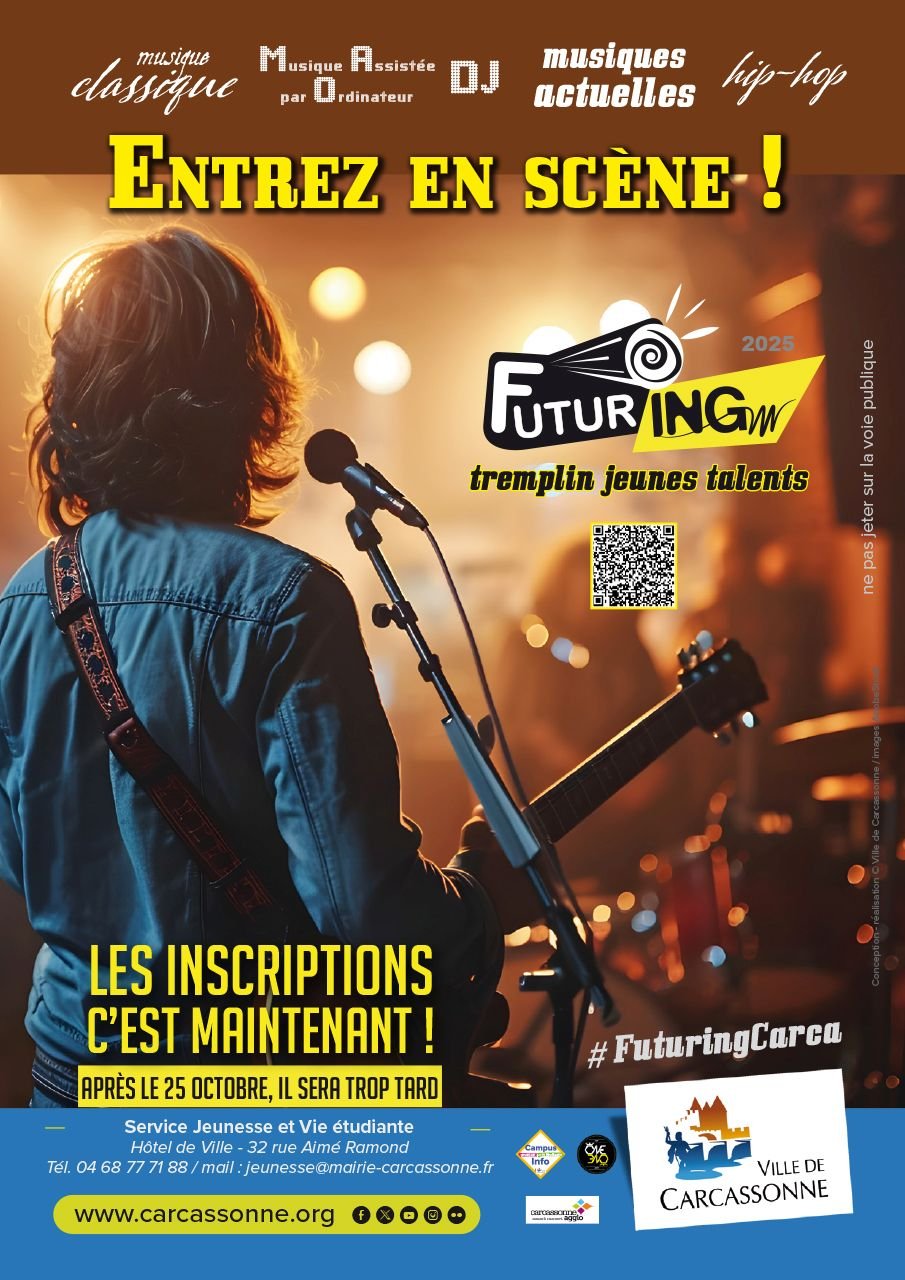 Campus Info - Service Jeunesse et Vie Etudiante Campus Info - Service Jeunesse et Vie Etudiante Festival Futuring - Tremplin jeunes talents Jeunesse L'édition de 2025 : Soirée musique Classique le samedi 8 novembre à partir de 20h30 - Théâtre Jean-Alary Après-midi Battle Hip Hop le dimanche 9 novembre - Théâtre Jean-Alary Soirée Musiques Actuelles le samedi 15 novembre de 20h30 à minuit - Chapeau Rouge Soirée DJ / MAO le samedi 22 novembre de 20h30 à minuit - Chapeau Rouge Zoom de l'image Chaque année, le service Jeunesse de la Ville de Carcassonne organise le « Festival FUTURING - Tremplin Jeunes Talents » afin de permettre à de jeunes artistes locaux de connaitre leurs premières expériences sur scène. Organisé en partenariat avec l’association One-One et le conservatoire de Carcassonne-Agglo, le Festival « FUTURING » propose des soirées thématiques autour de la variété française et internationale, du rap, de Battle Hip-Hop, de la musique classique, du slam ou du rock. Vous êtes membre d’un groupe de musique ou artiste solo et vous souhaitez à votre tour passer sur scène, n’hésitez plus !Entièrement gratuit, ce festival a fêté sa 14ème édition en 2024. pdf Dossier d'inscription Musique Classique Télécharger pdf Dossier d'inscription Musiques Actuelles / DJ / MAO Télécharger pdf Dossier d'inscription Hip Hop Télécharger pdf Règlement 2025 Télécharger Zoom de l'image Zoom de l'image Zoom de l'image Zoom de l'image Zoom de l'image Zoom de l'image Zoom de l'image Zoom de l'image Zoom de l'image Zoom de l'image Zoom de l'image