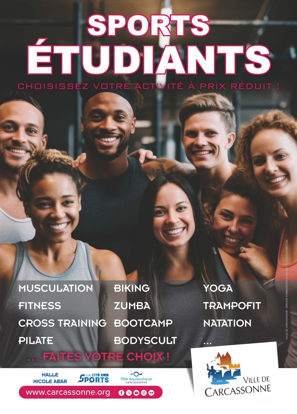 Sports Étudiants Jeunesse Sport Halle aux sports Nicole Abar Lla Direction des Sports met en place un programme d’activités physiques et sportives à destination des étudiants des établissements d’enseignement supérieur de la ville.Ces activités sont encadrées par les éducateurs sportifs de la Ville qui proposent des activités de loisirs mais aussi un enseignement et un suivi pédagogique, notamment pour les préparations aux concours. Au programme : Gym, Fitness, Crosstraining et Running.Tarif : une activité/semaine pour 36.50€ l'annéeLes activités sont pratiquées à la Halle aux sports Nicole ABAR - Le jeudi de 18h à 19h30. Zoom de l'image Inscriptions uniquement sur rendez-vous auprès : Direction des sportsTél : 04 68 77 73 56sport@mairie-carcassonne.fr pdf Formulaire d'inscription à télécharger Télécharger