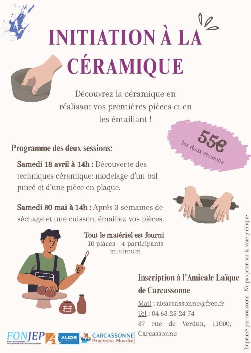Agenda des manifestations Atelier : invitation à la céramique Atelier - Stage Amicale Laïque de Carcassonne Samedi 18 avril et 30 mai à 14h Amicale Laïque de Carcassonne Découvrez la céramique en réalisant vos premières pièces et en les émaillant ! Programme des deux sessions : Samedi 18 avril à 14h : Découverte des techniques céramique: modelage d’un bol pincé et d’une pièce en plaque. Samedi 30 mai à 14h : Après 3 semaines de séchage et une cuisson, émaillez vos pièces. Tout le matériel est fourni 10 places - 4 participants minimum Inscription à l’Amicale Laïque de CarcassonneMail : alcarcassonne@free.frTel : 04 68 25 24 74 Zoom de l'image Tarif(s) 55€ les deux sessions