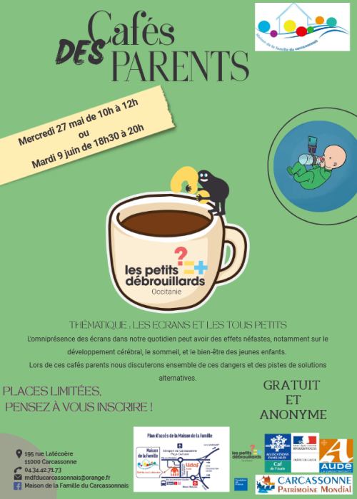 Agenda des manifestations Cafés des parents : Les écrans et les tous petits Débat Mercredi 27 mai de 10h à 12h et mardi 09 juin de 18h30 à 20h Maison de la famille du Carcassonnais, 195 rue Latécoère, 11000 Carcassonne L'omniprésence des écrans dans notre quotidien peut avoir des effets néfastes, notamment sur le développement cérébral, le sommeil, et le bien-être des jeunes enfants. Lors de ces cafés parents nous discuterons ensemble de ces dangers et des pistes de solutions alternatives. Places limitées, pensez à vous inscrire !04.34.42.71.73 ou mdfducarcassonnais@orange.fr Zoom de l'image Gratuit dans la limite des places disponibles