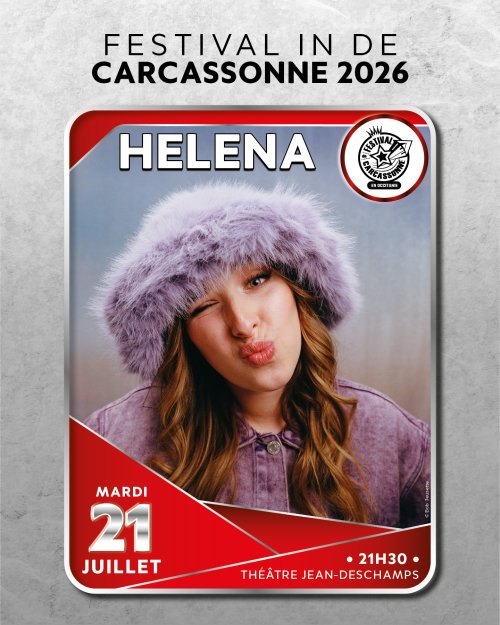 Agenda des manifestations Héléna [Variété Française] Festival IN Musique Théâtre Jean-Deschamps mardi 21 juillet 21h30 Théâtre Jean-Deschamps Après avoir conquis le public de la Star Academy, Héléna poursuit son ascension fulgurante et s’impose désormais comme l’une des nouvelles voix incontournables de la scène française. Avec sa voix lumineuse, son élégance naturelle et des titres déjà plébiscités par le public, elle promet une soirée douce, moderne et vibrante au Festival de Carcassonne 2026. Après l’annonce évènement de ses premières dates de concert en solo, pour la plupart sold-out en quelques minutes seulement et une première tournée en Zénith & Arena, Héléna poursuit sur sa lancée et prolonge le plaisir en festivals dès le printemps 2026. Son premier album “Hele” est à son image : aussi touchant qu’authentique. Déjà certifié platine, “Hele” est un plongeon tête baissée dans les doutes et les joies qui habitent une fille de 22 ans, entre la célébrité soudaine, la musique, les peines de cœur et d’amitié.... “Hélé 2”, réédition parue le 10 octobre 2025, tire le fil et confirme les talents de composition et la sincérité des textes d’Héléna. Avec sa voix douce et puissante, son énergie solaire et sa personnalité attachante, la révélation musicale Héléna que ses compatriotes Belges (et pas que) surnomment la “Reine de Belgique” vous invite aujourd’hui à plonger dans son univers musical, teinté de pop électrique et acoustique, où chaque note résonne avec émotion. Sur le Web www.instagram.com/helena_blly Zoom de l'image Achetez vos places Tarif(s) Placement libre : 59€* Carré Or : 69€* *Frais de location inclus. Seules les places en carré d’or sont numérotées. Votre contact PAC Billetterie Centre de Congrès du Dôme Entrée parking du Dôme Du lundi au jeudi de 10h à 12h30 et de 14h à 17h30 Le vendredi de 10h à 12h30 - Fermé l'après-midi 04 68 11 59 15 pacbilletterie@mairie-carcassonne.fr pac-billetterie.tickandlive.com