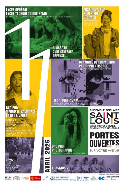 Agenda des manifestations Journée portes ouvertes : Ensemble scolaire Saint-Louis Portes ouvertes samedi 11 avril de 9h00 à 13h00 Lycée polyvalent Saint Louis : 77 rue Aimé Ramond 11000 Carcassonne Nous présenterons ce jour les filières du : Lycée général et technologique : 2nd générale et 2nd défense Première et Terminale générale Première et Terminale STMG Enseignement supérieur : BTS MCO en 2 ans Lycée professionnel : Bac Pro Métiers du commerce et de la Vente option A et option B option UF2S (Unité facultative secteur sportif) Bac Pro Photographie option plongée « photo sous-marine » Bac Pro Communication Visuelle Pluri Média 3 Prépa métiers Les immersions sont ouvertes : merci de contacter l’établissement Zoom de l'image Demande de pré-inscription
