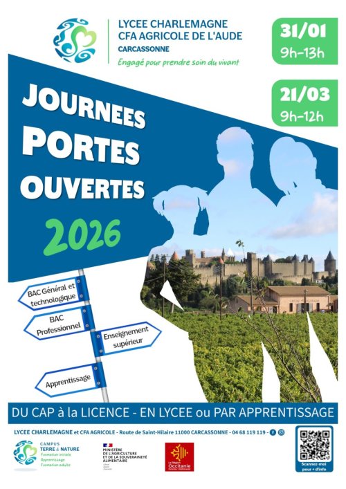 Agenda des manifestations Journée portes ouvertes : Lycée Charlemagne Portes ouvertes Samedi 31 janvier et 21 mars 2026 Lycée Charlemagne, Route de Saint-Hilaire, 11000 Carcassonne Le lycée Charlemagne CFA Agricole de l'Aude vous ouvre ses portes les 31 janvier et 21 mars 2026. BAC général et technologique BAC professionnel Enseignement supérieur Apprentissage Zoom de l'image Contact Campus terre et nature