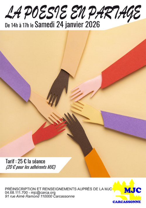 Agenda des manifestations La Compagnie Oui Bizarre présente La Poésie en partage Atelier animé par Isabelle Luccioni Atelier - Stage MJC de Carcassonne vendredi 24 avril de 14h00 à 17h00 MJC de Carcassonne Atelier de poésie – avec Isabelle Luccioni, Compagnie Oui BizarreSamedi 24 Janvier, de 14h à 17hà la MJC de Carcassonne Venez explorer la poésie contemporaine et classique, et pourquoi pas partager la vôtre ?Au programme :✨ Lecture à haute voix avec utilisation d'un micro✨ Écoute du rythme des mots✨ Compréhension et transmission d’un texte au public Un rendez-vous régulier pour goûter aux plaisirs du verbe, de la voix et de la scène.📞 Infos & pré-inscriptions auprès de la MJC de Carcassonne. Zoom de l'image Tarif(s) 25€ la séance (20€ pour les adhérents de la MJC) Votre contact MJC - Maison des Jeunes et de la Culture 04 68 11 17 00 mjc@carca.org mjc-carca.org