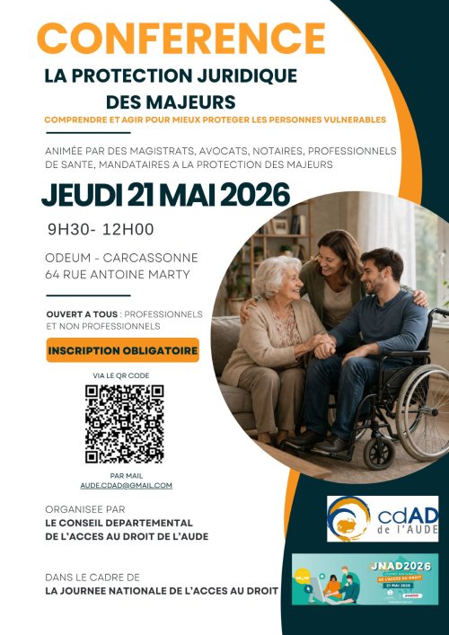 Agenda des manifestations La protection juridique des majeurs Conférence L'Odeum Social / Santé /Solidarité jeudi 21 mai de 9h30 à 12h00 L'Odeum Conférence organisée par le Conseil Départemental de l'Accès au Droit de l'Aude dans le cadre de la journée nationale de l'accès au droit, pour comprendre et agir pour mieux protéger les personnes vulnérables. Animée par des magistrats, avocats, notaires, professionnels de santé, mandataires à la protection des majeurs. Sur le Web Inscription obligatoire Zoom de l'image Tarif(s) Ouvert à tous sur inscription Contact Le Conseil Départemental de l'Accès au Droit de l'Aude (CDAC11) aude.cdad@gmail.com