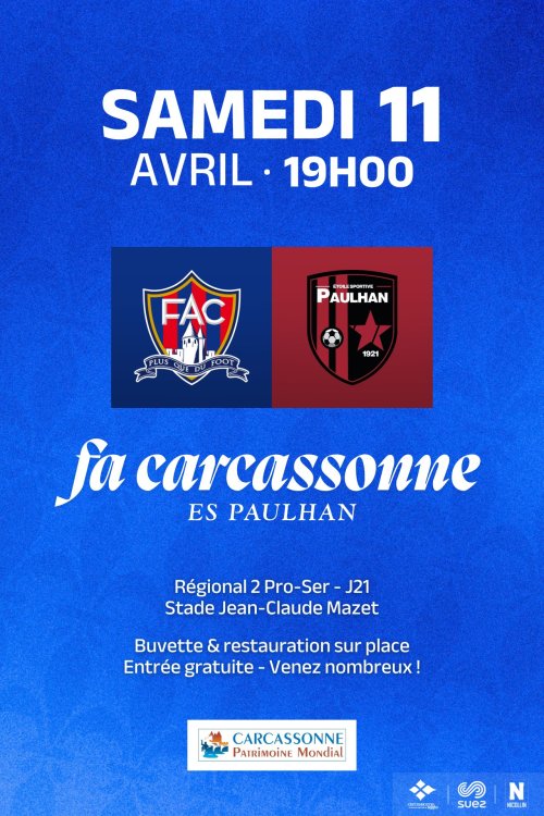 Agenda des manifestations Match de Football : Carcassonne/ Paulhan Sport Stade Jean-Claude Mazet samedi 11 avril 19h00 Stade Jean-Claude Mazet L'équipe le FAC reçoit l'équipe de foot de Paulhan. Venez soutenir votre équipe ! Zoom de l'image Tarif(s) Gratuit Contact Football Agglomération Carcassonne rue André Le Nôtre 11000 Carcassonne