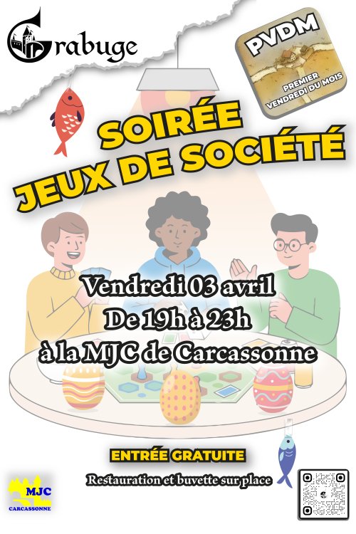 Agenda des manifestations PVDM d'Avril Attraction - Jeux MJC de Carcassonne vendredi 3 avril de 19h00 à 23h00 MJC de Carcassonne Zoom de l'image Retrouvez-nous pour le PVDM du mois d’avril ! Au programme : les incontournables jeux de société de notre ludothèque, le croc “poisson d’avril”, des chocolats de Pâques, le tout saupoudré de bonne humeur ! Entrée gratuite pour tous, ce serait dommage de s’en priver 😉 Zoom de l'image Gratuit