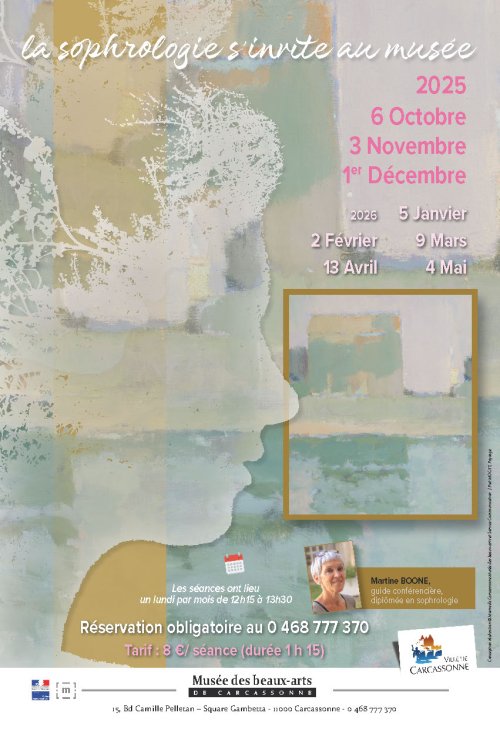 Agenda des manifestations Séance de sophrologie Musée des Beaux-Arts Autres Musée des Beaux-Arts lundi 4 mai 12h00 Musée des Beaux-Arts Le musée de beaux-arts de la ville poursuit cette expérience originale d'immersion dans ses riches collections d’œuvres, pour expérimenter le lâcher-prise grâce à l'art et offrir une perception plus intuitive et émotionnelle des œuvres. RDV pour la première séance de sophrologie de la saison menée par Martine Boone, guide conférencière diplômée en sophrologie. Renseignements et réservations : 04 68 77 73 70 À noter que d’autres séances sont programmées : elles auront lieu un lundi par mois, de 12h15 à 13h30, de novembre 2025 à mai 2026. Zoom de l'image Tarif(s) 8€ la séance Votre contact Musée des Beaux-Arts - Accueil 15 boulevard Camille Pelletan Tarif : Entrée gratuiteHoraires d'ouverture :Du 1er octobre au 31 mars : du mardi au samedi de 10h à 12h30 et de 13h30 à 18h (fermé le dimanche et lundi)Ouvert le 1er dimanche du mois de 14h à 17hFermé les jours fériésDu 1er avril au 30 septembre : tous les jours de 10h à 12h30 et de 13h30 à 18hFermé les jours fériésAvant toute visite de groupe libre ou guidée, il est nécessaire de s'adresser au musée des beaux-arts de Carcassonne par mail à musee@mairie-carcassonne.fr afin de vérifier les disponibilités des créneaux horaires. 04 68 77 73 70 musee@mairie-carcassonne.fr