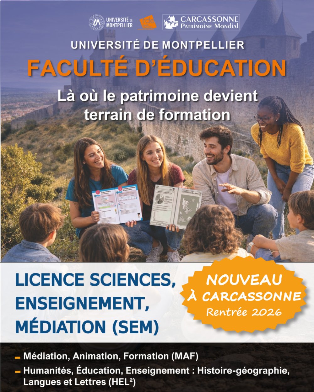 La faculté d’Education de l’université de Montpellier s’apprête à créer un parcours Médiation, Animation, Formation (MAF) dans le cadre de la Licence Sciences, Enseignement, Médiation (SEM), sur le site de Carcassonne. Ce cursus destine les étudiants et professionnels qui le souhaitent à développer des compétences en conception et animation de dispositifs de formation, à coordonner des projets et à accompagner des transitions professionnelles. A Carcassonne, l’accent sera mis sur la médiation culturelle, patrimoniale et environnementale, en lien avec les territoires. Grâce à cette nouvelle formation, les futurs étudiants pourront se diriger vers des emplois de chargé de promotion du patrimoine, de médiateur culturel ou environnemental, ou de coordinateur de projets culturels ou patrimoniaux.