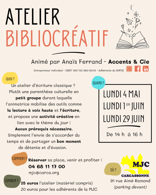 Agenda des manifestations Ateliers bibliocréatif Atelier - Stage MJC de Carcassonne Les 04/06, 01/06 et 29/06 de 14h à 16h MJC de Carcassonne Un atelier d’écriture classique ? Plutôt une parenthèse culturelle en petit groupe durant laquellel’animatrice mobilise des outils comme la lecture à voix haute et l’écriture, et propose une activité en lien avec le thème du jour ! Aucun prérequis nécessaire. Simplement l’envie de s’accorder du temps et de partager un bon moment de détente, d’évasion, de créativité. Animé par Anaïs Ferrand - Accents & Cie Réservez votre place auprès de la MJC : 04 68 11 17 00 ou mjc@carca.org Zoom de l'image Tarif(s) 25€ l'atelier (matériel compris) 20€ pour les adhérents de la MJC