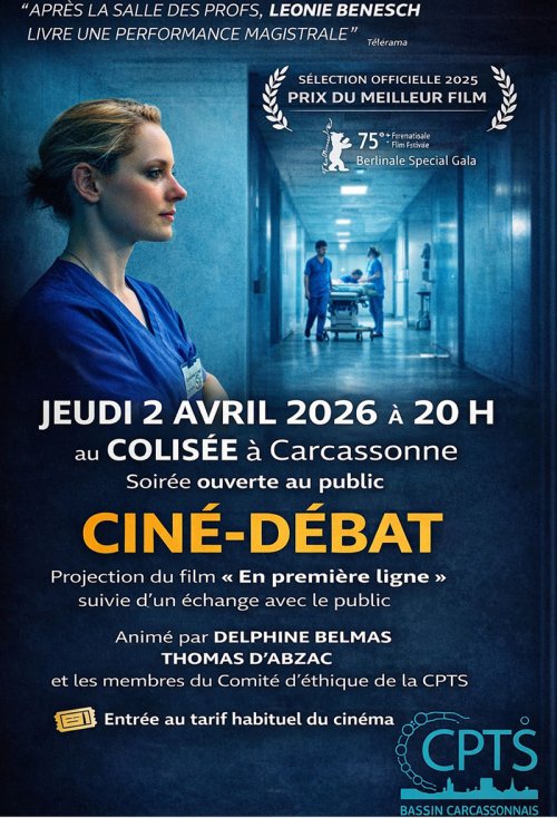 Agenda des manifestations Ciné débat Débat Cinéma Cinéma le Colisée jeudi 2 avril 20h00 Cinéma le Colisée Une soirée pour découvrir les réalités du soin. La soirée débutera par la projection du film « En première ligne », qui plonge le spectateur dans le quotidien des professionnels de santé. Ce film aborde avec humanité les situations auxquelles ils sont confrontés : décisions difficiles, accompagnement des patients, engagement et réalité du terrain. La projection sera suivie d’un temps d’échange avec le public, animé par Delphine Belmas,infirmière libérale à Carcassonne, Thomas D’Abzac, directeur d’établissement polyclinique Montréal, et les membres du comité d’éthique de la CPTS. Ce moment permettra de dialoguer ensemble autour des questions humaines et éthiques liées aux soins. À travers cette soirée, la CPTS souhaite créer un moment de rencontre et de dialogue entre professionnels de santé et citoyens, afin de mieux comprendre les réalités du soin et les valeurs humaines qui les accompagnent. Zoom de l'image Tarif(s) Tarif : prix habituel du cinéma Votre contact Cinéma le Colisée Boulevard Omer Sarraut www.cgrcinemas.fr/carcassonne-colisee