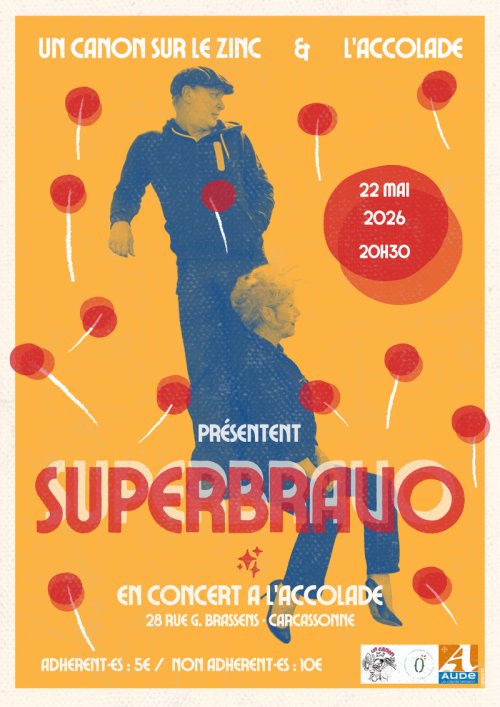 Agenda des manifestations Concert : Superbravo Musique vendredi 22 mai de 20h30 à 22h00 L'accolade {Café associatif}, 28 Rue Georges Brassens, 11000 Carcassonne Zoom de l'image © TF À l'origine de Superbravo, on retrouve Armelle Pioline, chanteuse de Holden, et Michel Peteau, guitariste inspiré et producteur singulier. Ensemble, ils s'inventent des mots, des sons, des silences et des formules, sur un lit de guitares obliques, d'orgues mal léchés et de chants liquides. Sur scène, le duo joue un répertoire en suspension, entre pop et néo-folk, se chargeant ici et là de couleurs psychédéliques et surréalistes. Leur nouvel - et quatrième - album, 'La Digue', est sorti à l'automne 2024 sur Marelle Music. Sur le Web www.instagram.com/superbravoband Zoom de l'image © TF Tarif(s) Plein tarif 10 € / Adhérent·e 5 € Votre contact Café associatif de Carcassonne 04 22 91 97 84 contact@laccoladecarca.fr Plus d'informations...