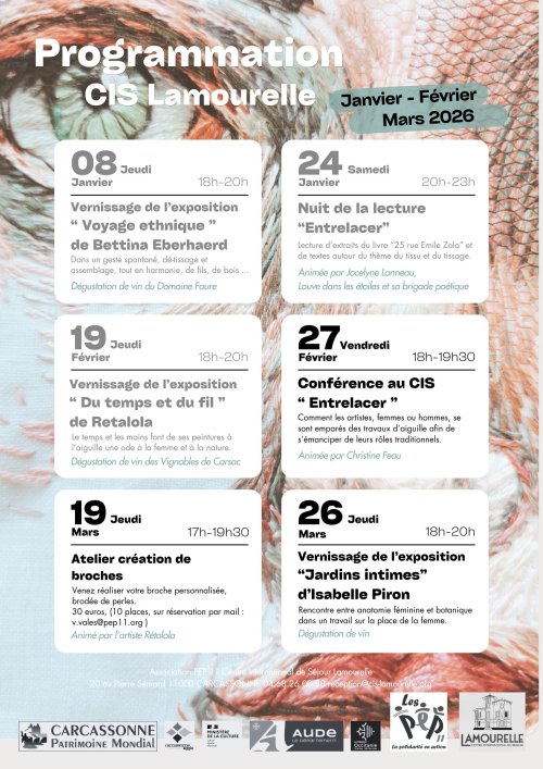 Agenda des manifestations Conférence "Le textile dans l'art contemporain" Conférence Centre International de Séjour Lamourelle vendredi 27 février 18h00 Centre International de Séjour Lamourelle Comment les artistes d'art contemporain, femmes et hommes, se sont emparés des travaux d'aiguille pour s'émanciper de leurs rôles traditionnels.Présentée par Me Christine Feau, diplômée en Histoire de l'Art. Cette conférence fait partie du cycle culturel nommé "Entrelacer" qui réunit trois expositions d'artistes féminines travaillant autour du fil, du tissu en général et faisant écho au passé industriel de la Maison Lamourelle, anciennepropriété d'un chiffonnier, aujourd'hui lieu culturel géré par l'association PEP 11. L'exposition "Du temps et du fil" de Retalola sera ouverte du 19 février au 19 mars 2026 de 9h à 18h Zoom de l'image Gratuit