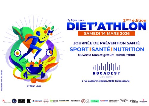 Agenda des manifestations Diét'Athlon Autres Social / Santé /Solidarité samedi 14 mars de 10h00 à 17h00 Rocadest, 2 rue Joséphine Baker, 11000 Carcassonne Le Diet'Athlon par Laura Tajan vous accueille à Rocadest ! Participez à cette journée de prévention sport, santé et nutrition. Plan des différents pôles Zoom de l'image Zoom de l'image Gratuit