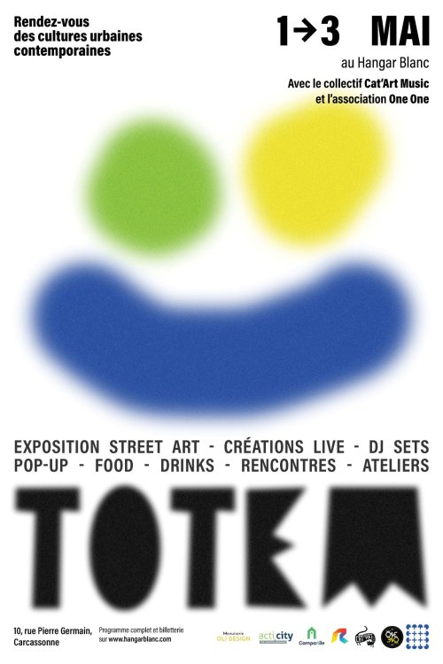 Agenda des manifestations Exposition : Totem Exposition Tourisme - Loisirs vendredi 1 mai au dimanche 3 mai 10 rue Pierre Germain Le Hangar Blanc en collaboration avec le collectif CAt'Art Music et l'association One One, organise un événement dédié aux cultures urbaines contemporaines "Totem". Artistes visuels, graffeurs et DJ investissent le lieu pour une expérience ouverte, immersive et en constante évolution. Pensé comme un parcours libre, TOTEM invite à circuler entre les espaces, au rythme des œuvres qui se créent en direct et des sets musicaux. Une dizaine d’artistes développent chacun un univers singulier autour de la thématique annuelle : la fête. Certaines œuvres seront produites et finalisées sur place, au contact du public. Sur le Web Billetterie accessible sur le site web le Hangar Blanc ou sur place. Zoom de l'image Tarif(s) • Pass 1 jour : 8€• Pass 3 jours : 15€• Pass réduit : 6€• Pass réduit 3 jours : 10€• Gratuit pour les moins de 12 ans• Pass adhérents Acti City 3 jours : 6€ Contact Le Hangar Blanc