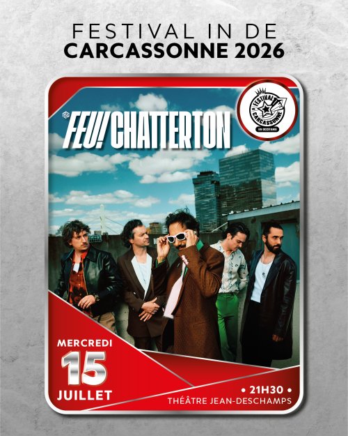 Agenda des manifestations Feu! Chatterton Festival IN Musique Théâtre Jean-Deschamps mercredi 15 juillet 21h30 Théâtre Jean-Deschamps Maître des mots et des atmosphères envoûtantes, le groupe Feu! Chatterton investira le Théâtre Jean-Deschamps le 15 juillet de leur poésie électrique, leurs envolées rock et leur intensité magnétique ! Feu! Chatterton est de retour, plus incandescent que jamais ! Trois ans après la sortie de leur album iconique Palais d’argile, couronné d’un disque de platine, de multiples nominations aux Victoires de la musique, et d’une tournée triomphale, les Feu! Chatterton rallument la flamme. Ils retrouvent la scène, ce lieu électrique qu’ils envoûtent comme personne, avec cette élégance fiévreuse et cette intensité rare qui font d’eux un groupe à part, viscéralement connecté à son public. Avec Labyrinthe, leur nouvel album, le groupe signe un retour magistral : un disque salué par la critique et déjà plébiscité par le public. Sur le Web www.feuchatterton.fr Zoom de l'image Achetez vos places Tarif(s) Placement libre : 59€* Carré Or : 69€* *Frais de location inclus.Seules les places en carré d’or sont numérotées Votre contact PAC Billetterie Centre de Congrès du Dôme Entrée parking du Dôme Du lundi au jeudi de 10h à 12h30 et de 14h à 17h30 Le vendredi de 10h à 12h30 - Fermé l'après-midi 04 68 11 59 15 pacbilletterie@mairie-carcassonne.fr pac-billetterie.tickandlive.com