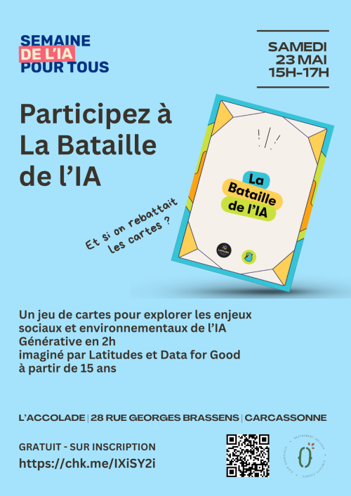 Agenda des manifestations La Bataille de l'IA Atelier - Stage samedi 23 mai de 15h00 à 17h00 L'accolade {Café associatif}, 28 Rue Georges Brassens, 11000 Carcassonne Dans le cadre de la Semaine de l'IA pour tous (et toutes), la Bataille de l'IA arrive à Carcassonne et vous permet de découvrir de manière ludique les enjeux sociaux et environnementaux de l’IA ! Venez rebattre les cartes à partir de 15 ans. Inscrivez-vous : https://chk.me/IXiSY2i Zoom de l'image Gratuit dans la limite des places disponibles Votre contact Café associatif de Carcassonne 04 22 91 97 84 contact@laccoladecarca.fr Plus d'informations...