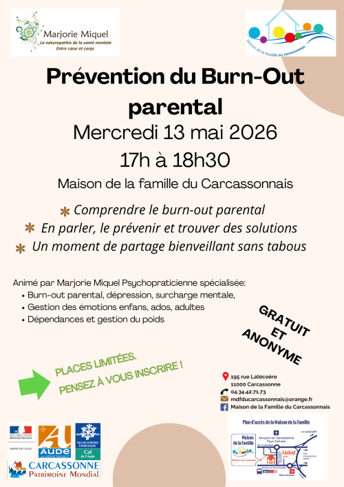 Agenda des manifestations Prévention du burn-out parental Débat mercredi 13 mai de 17h00 à 18h30 Maison de la famille du Carcassonnais, 195 rue Latécoère, 11000 Carcassonne Comprendre le burn-out parental, en parler, le prévenir et trouver des solutions. Un moment de partage bienveillant sans tabous. Animé par Marjorie Miquel Psychopraticienne spécialisée: Burn-out parental, dépression, surcharge mentale, Gestion des émotions enfants, ados, adultes Dépendances et gestion du poids Places limitées, pensez à vous inscrire !04.34.42.71.73 ou mdfducarcassonnais@orange.fr Zoom de l'image Gratuit dans la limite des places disponibles