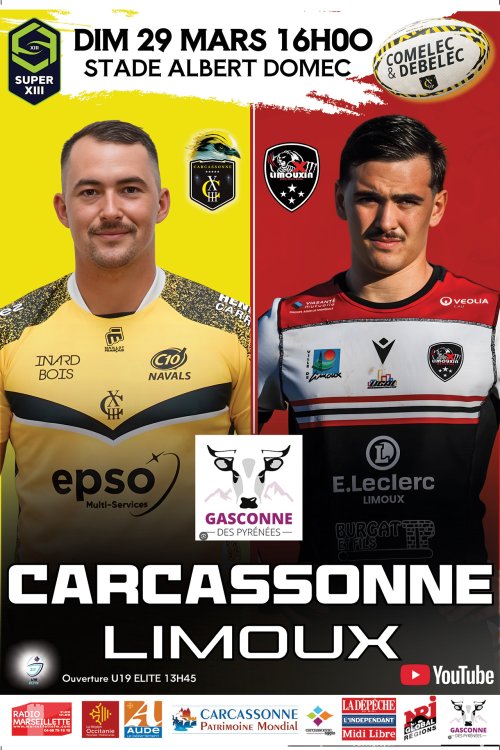 Agenda des manifestations Rugby à XIII : Carcassonne XIII / Limoux Sport Stade Albert Domec dimanche 29 mars 16h00 Stade Albert Domec Venez soutenir votre équipe ! Ouverture U19 ELITE à 13h45 Zoom de l'image
