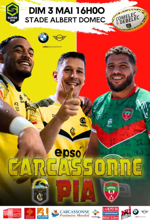 Agenda des manifestations Rugby à XIII : Carcassonne XIII / PIA Sport Stade Albert Domec Sport dimanche 3 mai 16h00 Stade Albert Domec L'équipe de rugby Carcassonne XIII reçoit l'équipe PIA XIII Baroudeur. Venez soutenir votre équipe ! Zoom de l'image Votre contact Carcassonne XIII 04 68 77 59 01 contact@carcassonne13.fr Plus d'informations...