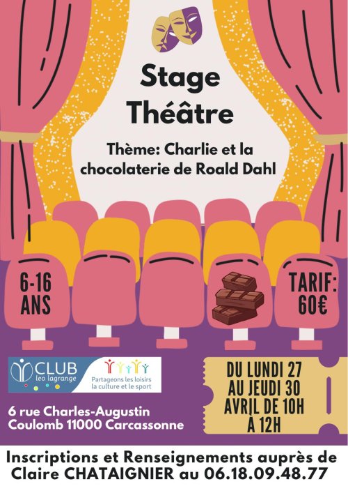 Agenda des manifestations Stage théâtre Atelier - Stage lundi 27 avril au jeudi 30 avril - de 10h à 12h Club Léo Lagrange, 6 rue Charles Augustin Coulomb, 11000 carcassonne Le Club Léo Lagrange de Carcassonne vous propose un stage de théâtre pour les enfants et ados de 6 à 16 ans. Venez jouer, dire, conter, mimer, exprimer... sur le thème de Charlie et la chocolaterie de Roald Dahl Plus de renseignements auprès de Claire Chataigner 06 18 09 48 77 Zoom de l'image © club Léo Lagrange Carcassonne Tarif(s) 60€ Payable en espèces, chèques ou chèques vacances Votre contact Club de loisirs Léo Lagrange cllcarcassonne@gmail.com cllcarca.fr