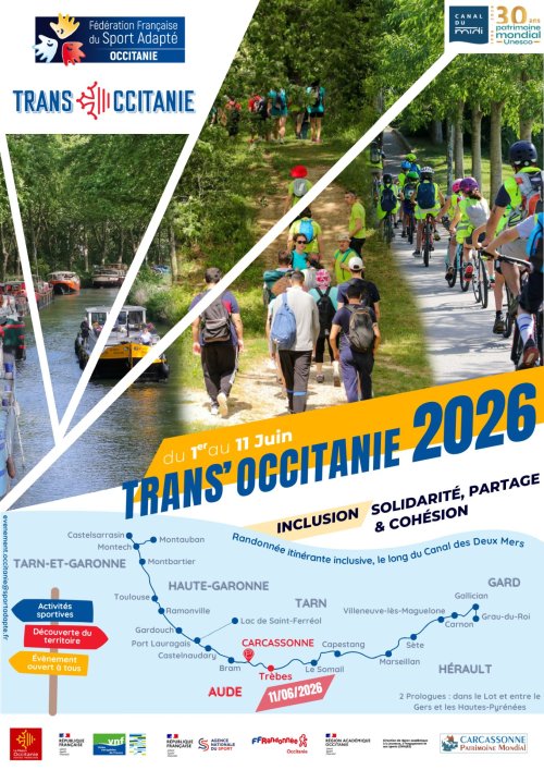 Agenda des manifestations Trans'Occitanie Sport jeudi 11 juin Canal du Midi À l’occasion de 30ème anniversaire de l’inscription du canal du Midi au patrimoine mondial de l’UNESCO, La Ligue Sport Adapté Occitanie organise la deuxième édition de “La Trans’Occitanie”, en collaboration avec la Région Occitanie et l’Entente Canal du Midi du 26 mai au 11 juin. La Trans’Occitanie est une randonnée itinérante inclusive à travers la Région Occitanie, le long du Canal des Deux Mers. Destinée à des publics présentant des troubles du neurodéveloppement et/ou des troubles psychiques, cet événement est ouvert à tous (associations, écoles, entreprises, grand public...) dans une démarche d’inclusion inversée. À travers chaque étape construite avec les acteurs du territoire, la Ligue Sport Adapté Occitanie, les Comités Départementaux Sport Adapté et les associations favorisent l’accès au sport et l’inclusion sociale, dans une dynamique participative et territoriale forte. Pour tous et totalement gratuite, la Trans'Occitanie encourage la rencontre et la mixité, en sensibilisant les participants aux enjeux de l’accessibilité et de la cohésion sociale. La Ligue Sport Adapté Occitanie est un organe déconcentré de la Fédération Française du Sport Adapté. Elle a pour mission « d’offrir à toute personne présentant des Troubles du Neurodéveloppement et/ou des Troubles Psychiques, quels que soient ses désirs, ses capacités et ses besoins, la possibilité de vivre la passion du sport de son choix dans un environnement voué à son plaisir, sa performance, sa sécurité et à l’exercice de sa citoyenneté ». La Trans’Occitanie 2026 en chiffres : 14 étapes à travers 9 départements 11 jours d’événement 25 villes étapes 230km à parcourir 1200 sportifs et éducateurs attendus 200 bénévoles et staffs mobilisés 150 personnes du grand public sensibilisés au handicap (écoles, entreprises, associations...) Chaque étape peut être réalisée à pied ou en vélo, en totalité ou en partie. Pour connaitre les différentes portions de chaque parcours, contactez-nous à l’adresse evenement.occitanie@sportadapte.fr Sur le Web Plus d'informations Zoom de l'image Contact Fédération Française du Sport Adapté Occitanie evenement.occitanie@sportadapte.fr